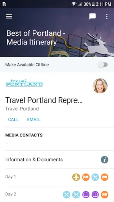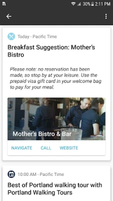 En av de fremste fordelene med din reisefølge er at den opererer helt uten behov for internett eller mobildata. Dette betyr at alle dine planer, fra frokost til kveldsarrangementer, er sikre og tilgjengelige uansett hvor i Portland du befinner deg. Hver eneste begivenhet er presentert i et elegant og lettlest format, komplett med detaljerte beskrivelser og eventuelle spesielle instruksjoner. Få en rask oversikt over dagens program eller dykk ned i spesifikke arrangementer med alt du trenger å vite, rett ved fingertuppene.