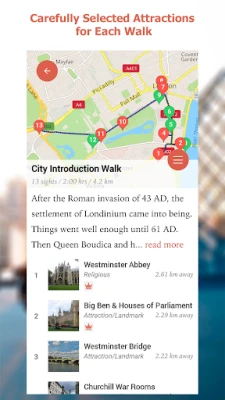 Last ned applikasjonen kostnadsfritt og få umiddelbar tilgang til et vell av informasjon. Du kan gratis se alle de inkluderte vandreturene for byen, samt detaljene for hver enkelt severdighet. I tillegg får du et fullt funksjonelt offline bykart og den hendige "Finn meg"-funksjonen, som nøyaktig viser din posisjon på kartet. Dette gir deg en fantastisk mulighet til å evaluere og oppleve appens kjernefunksjonalitet før du tar en beslutning om å utvide opplevelsen.