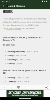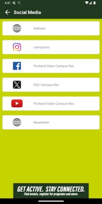Hold deg kontinuerlig oppdatert og tilkoblet. Du vil motta umiddelbare varsler om anleggsoppdateringer, viktige påminnelser og annen relevant informasjon direkte til din enhet. Denne proaktive kommunikasjonen sikrer at du aldri går glipp av en mulighet til å engasjere deg i universitetets dynamiske rekreasjonstilbud. Utforsk et bredt spekter av muligheter for trening, rekreasjon og generelt velvære, alt støttet av Portland State Universitys engasjement for din livskvalitet.