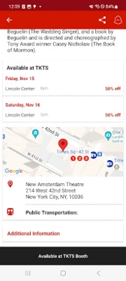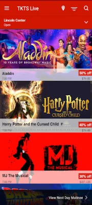 TKTS gir deg umiddelbar tilgang til det som til enhver tid er tilgjengelig ved de anerkjente TKTS Rabattbodene. Med en direkte kobling til displaytavlene, ser du nøyaktig hva de som står i kø ser – oppdatert i sanntid. Utforsk også en omfattende søkefunksjon som avdekker alt som foregår på scenene i New York City. Her finner du detaljerte beskrivelser av forestillinger, nøyaktige spilletider, teateradresser, informasjon om tilgjengelighet og lenker til offisielle nettsider for å sikre at du har all nødvendig kunnskap.